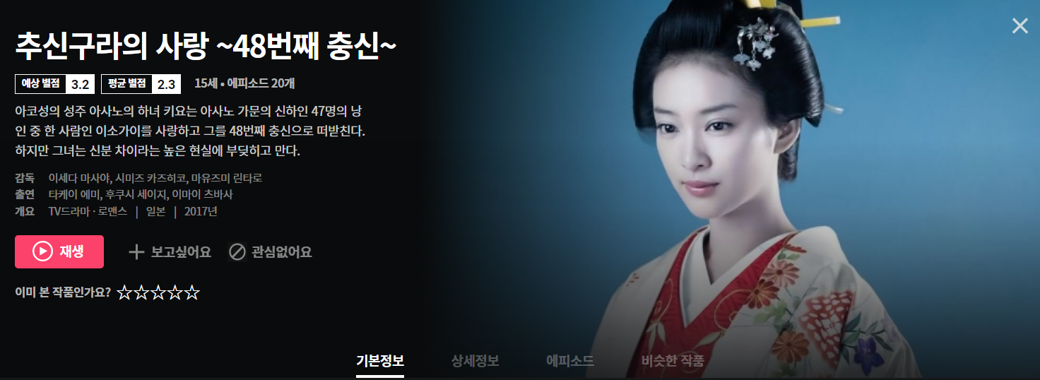 · 아코사건을 베이스로 한 일본역사물은 2편 봤고(엔딩만 기억이 나고 제목이 기억이 안 난다) 47명이 죽는 것에서 모두 끝이 났는데 이 작품은 그 뒷이야기도 풀어놔서 흥미롭게 봤다. 오히려 뒷이야기의 임팩트가 더 컸던 거 같다. 일본드라마의 전형적인 오글거림도 없고 전체적으로 꽤 잘 만든 수작. 영상미가 살짝 부족한 게 흠이지만 멋진 대사가 참 많다.